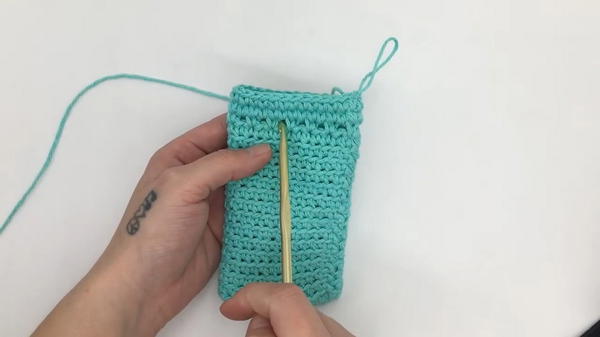 - Repeat this pattern (chain 1, skip a stitch, single crochet) around the bag.
