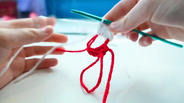 - Red and white yarn (Gabrielle recommends soft yarn; brand-specific details are in her video).