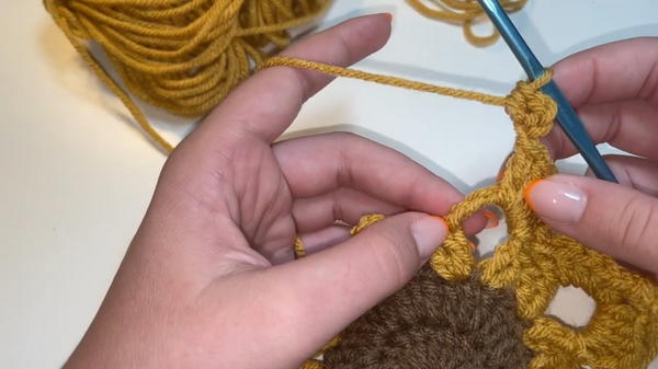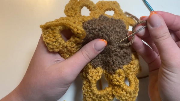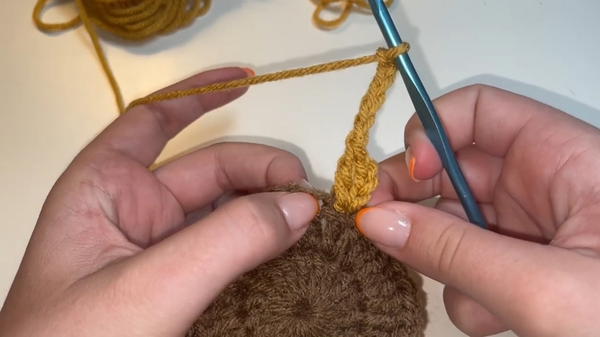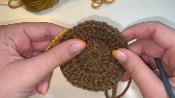 - Insert your hook into any stitch of the circle and pull the yellow yarn through. Secure with a knot.