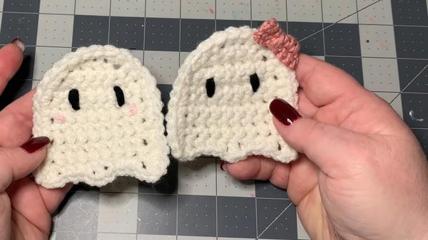 - Yarn: Weight #4 yarn in white (for the ghost), black (for the eyes), pink (for cheeks), and any additional color for the bow.
