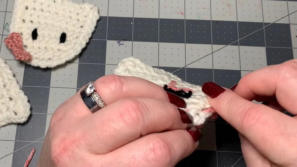 - Use pink yarn to add small blush-like stitches back and forth.