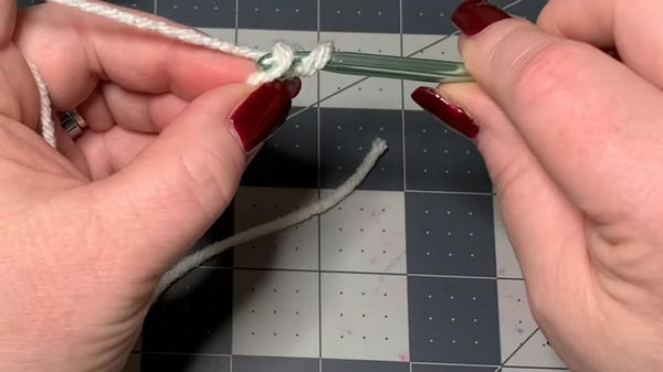 - Using the smaller hook (4mm), make a slip knot and chain 5.