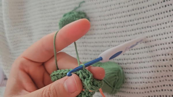 The tree begins with a foundation chain, followed by rows of half double crochet stitches that shape its classic triangular form.