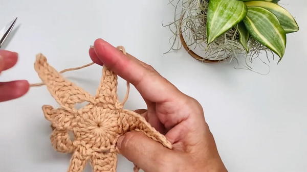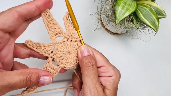 Subsequent rounds introduce chain spaces and slip stitches, shaping the five points of the star.