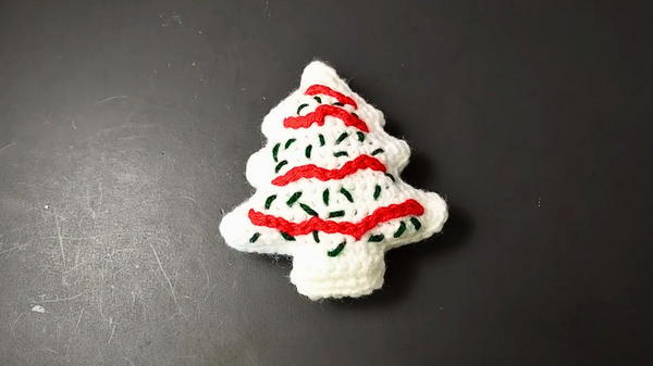 - Single crochet around the edges of the tree to give it a finished, “raised cake” appearance. Place three single crochets in the corners to achieve rounded edges where necessary.