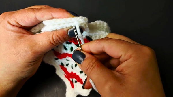 - Begin by pulling red yarn through the lower corner and work slip stitches across the surface to create curved, flowing lines.