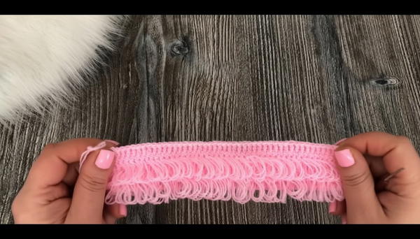 - Begin making tassels by inserting your hook in designated spots (between chains and on top of dc stitches).