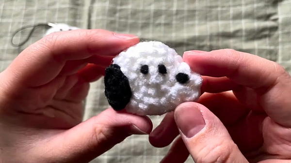 - Sew the ear onto one side of Snoopy’s head: Position it next to the snout and anchor it using stitches around the fourth round.