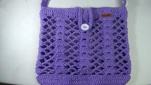 The foundation is worked in multiples of 12 stitches. The bottom is created with rows of double crochet stitches, then the bag's body is built using alternating loops of 5 and 3 chains combined with single crochet and treble crochet clusters to form a decorative mesh.