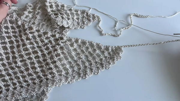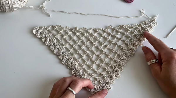 The main features of this design are the delicate lace net pattern formed by simple Double Crochet (DC) clusters and chain arches. Additionally, the method of starting each row with slip stitches (sl st) creates a clean, built-in picot-like edging (puntilla) along the two increasing sides of the triangle, giving it a finished look without needing a separate border row.