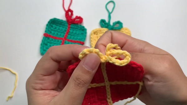 Edges are defined by placing two single crochets in each corner, ensuring a polished finish. The ribbon detail is cleverly added by slip stitching down the surface, followed by chaining to create two loops for the bow. A smaller crochet hook is used for added precision, while ends are woven neatly to complete the ornament.