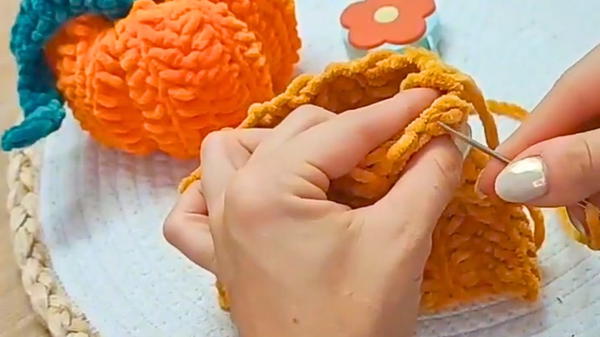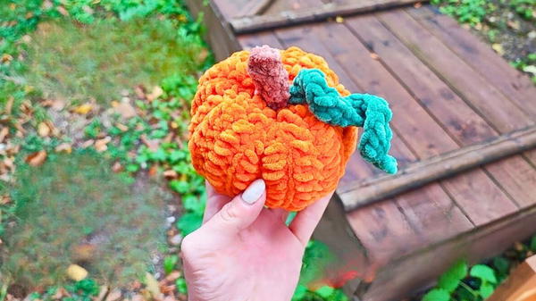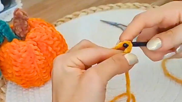Special Features: The technique uses a back loop only (BLO) method on the main body to create a ribbed texture, which mimics the natural ridges of a pumpkin. The shaping process uses tensioned thread lines to create the signature vertical "stripes" of the pumpkin.