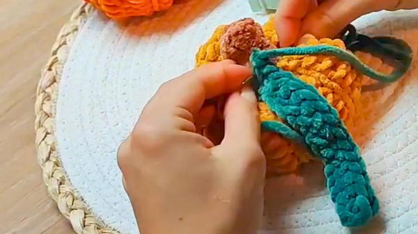 The process begins by crocheting a simple, rounded shape using basic stitches, gradually increasing to form a bulbous body.